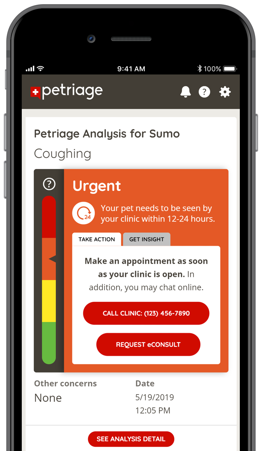 Petriage is always here for you and your pet. Get instant, actionable info about your pet’s health with our mobile app. Our dog and cat symptom checker uses rich algorithms to deliver vet-backed insight about the seriousness of your pet’s symptoms.